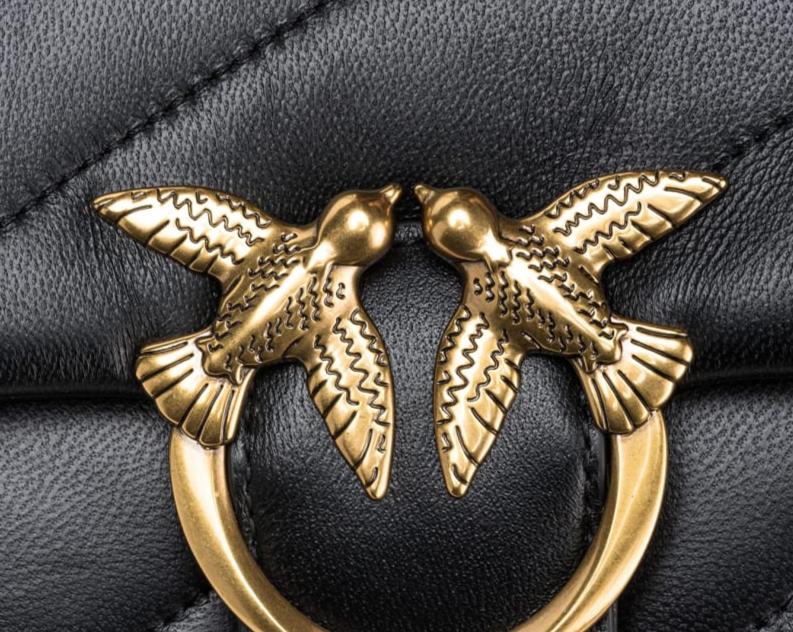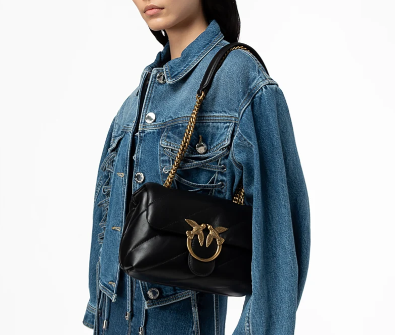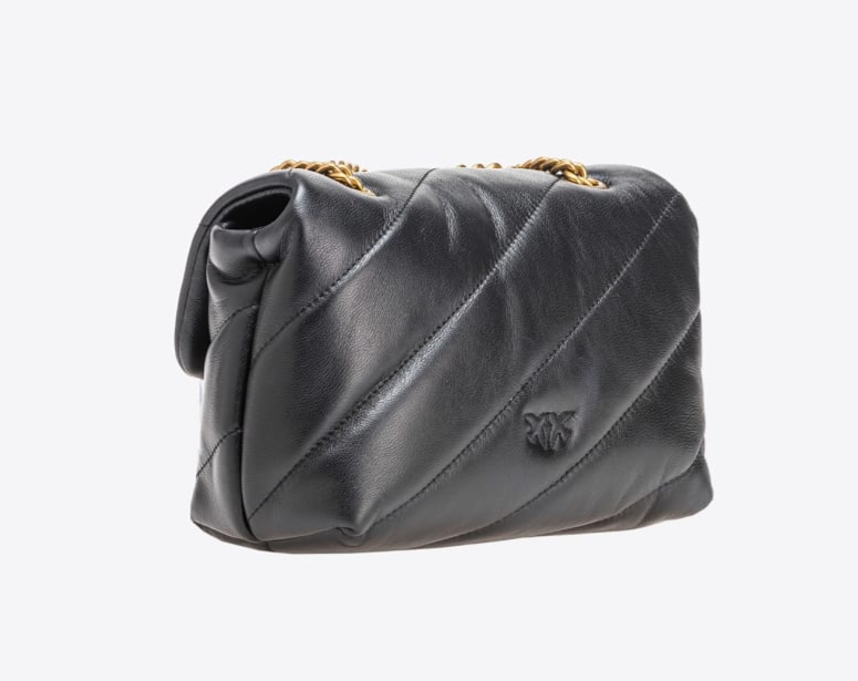 Mini Love Bag Puff de napa suave con maxiacolchado oblicuo. El cierre se completa con la emblemática hebilla Love Birds Diamond Cut de metal. El interior presenta un forro de microfibra con efecto ante e incluye un panel divisorio con cierre de cremallera y un bolsillo interno. La correa combina la clásica cadena redonda de metal con una práctica hombrera de napa.