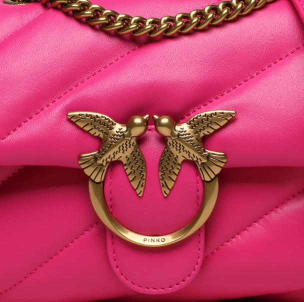 Mini Love Bag Puff de napa suave con maxiacolchado oblicuo. El cierre se completa con la emblemática hebilla Love Birds Diamond Cut de metal. El interior presenta un forro de microfibra con efecto ante e incluye un panel divisorio con cierre de cremallera y un bolsillo interno. La correa combina la clásica cadena redonda de metal con una práctica hombrera de napa.