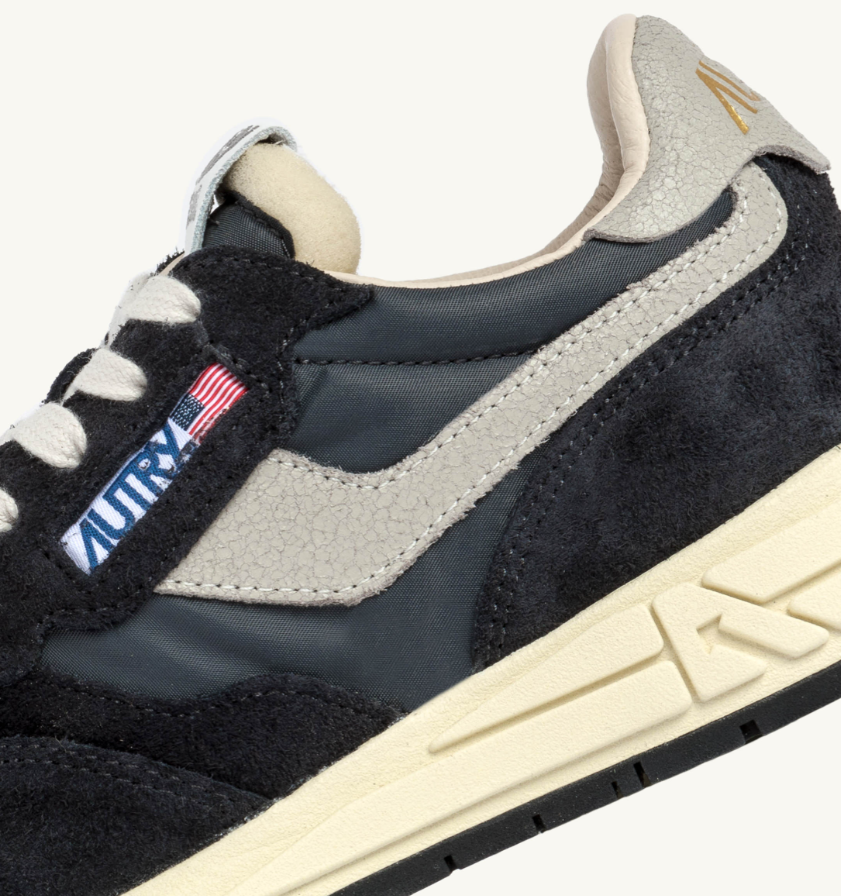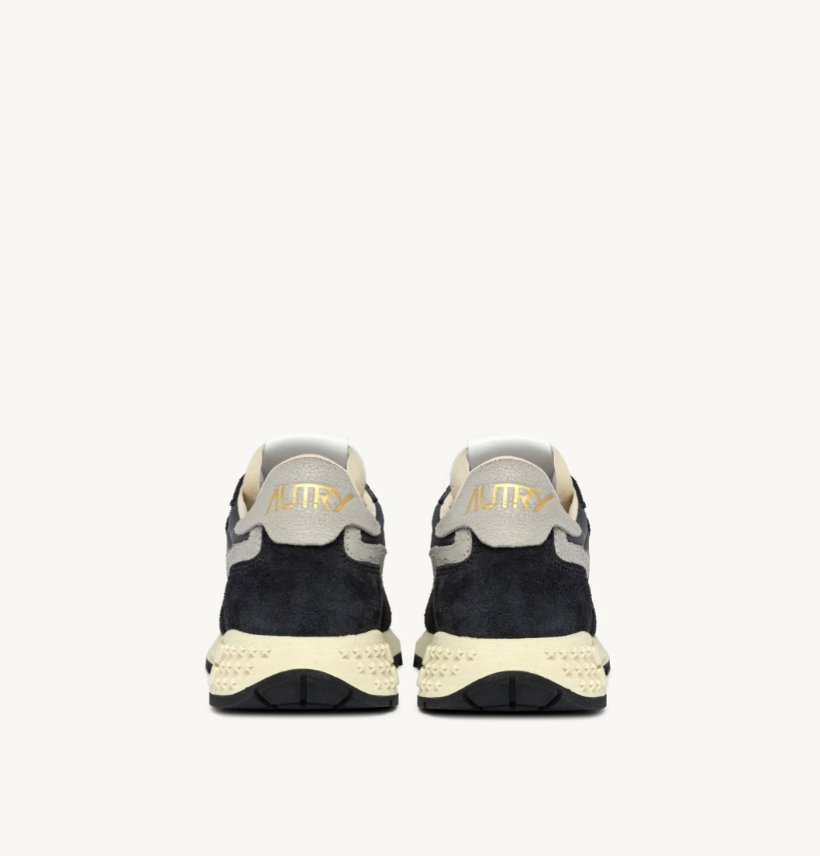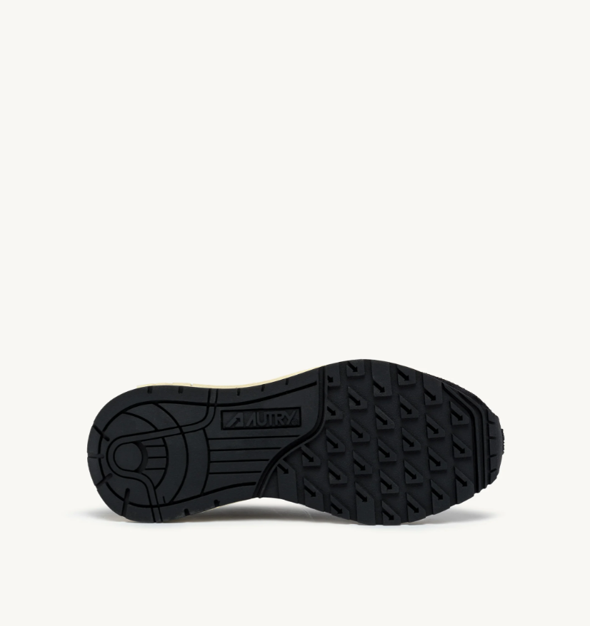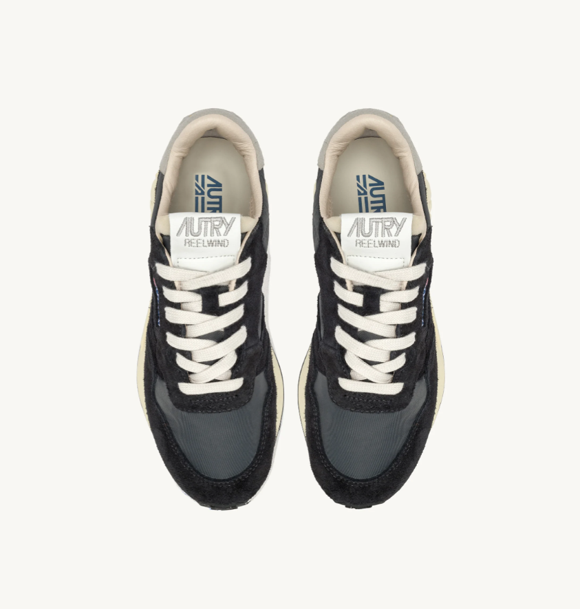 Innovadoras, ligeras y extremadamente flexibles, Reelwind son las zapatillas de Autry inspiradas en el mundo del running. El modelo para hombre está confeccionado en una mezcla de ante y nailon negro con aplicaciones de piel blanca en los laterales.