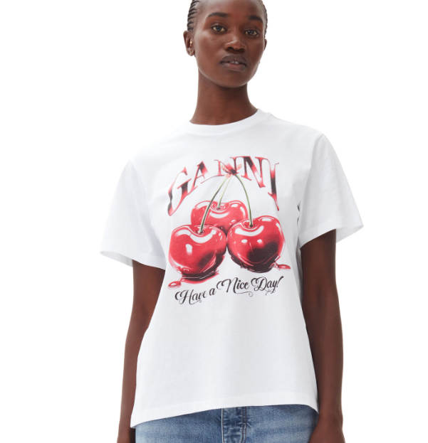 Esta camiseta relajada de jersey básico blanco con estampado de cerezas presenta un escote redondo, mangas cortas y un estampado gráfico de GANNI.
