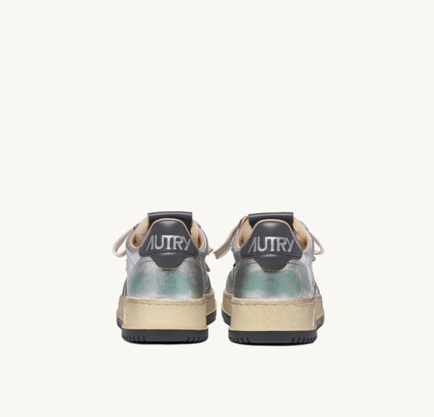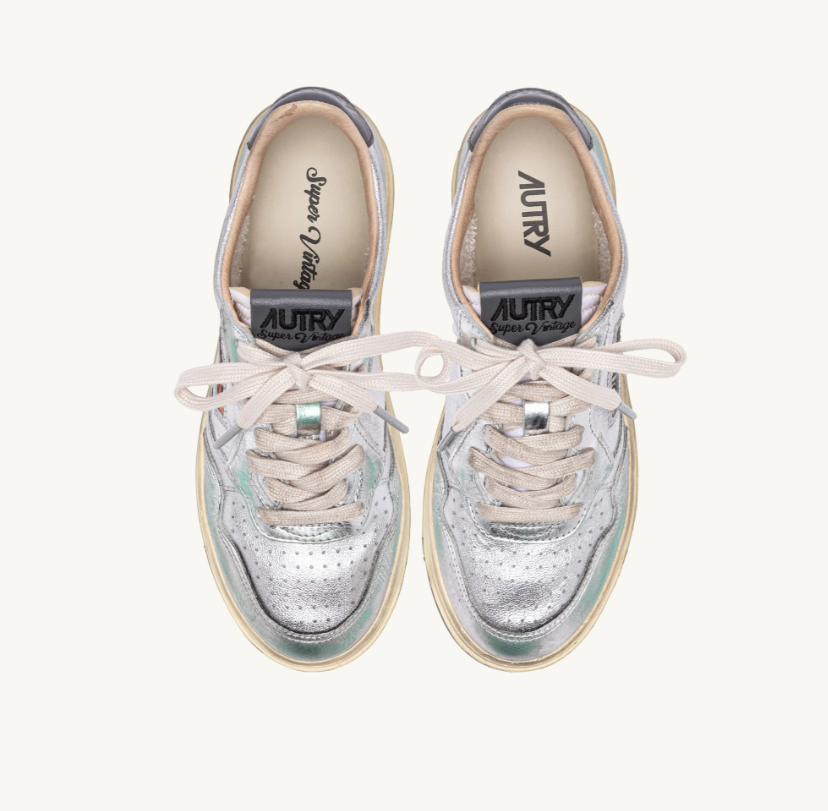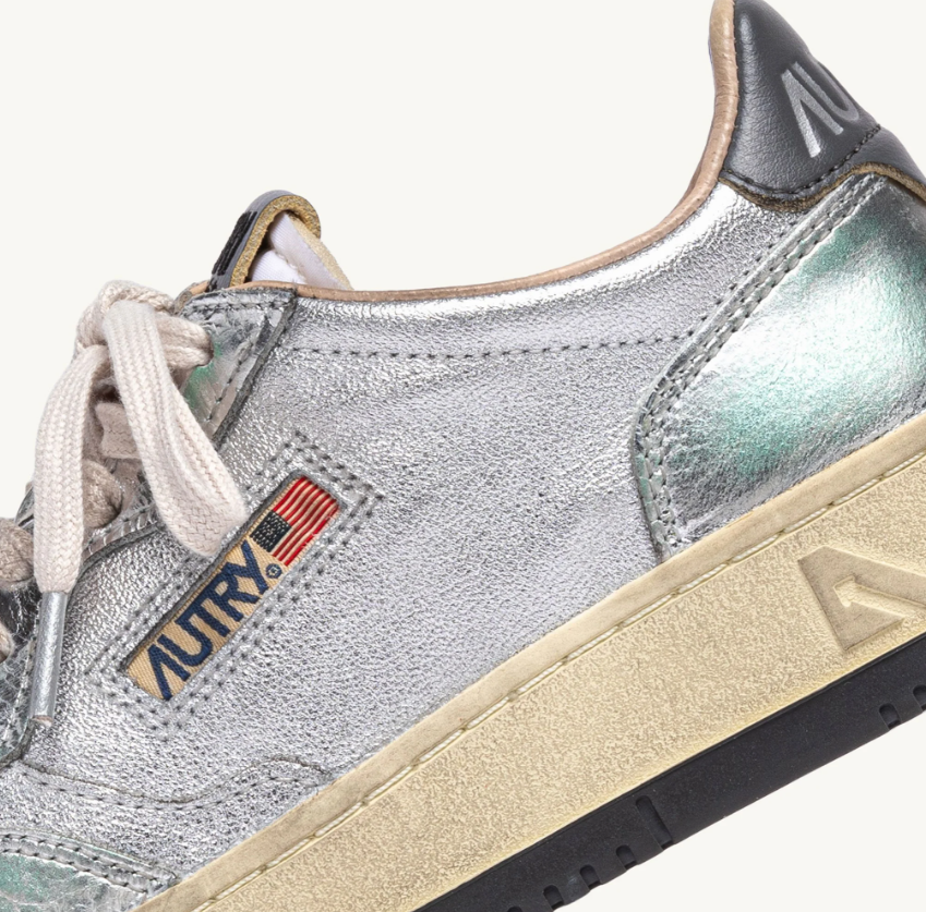 Esta zapatilla para mujer está confeccionada de piel de color plateado metalizado con aspecto desgastado y tonos verdes. La inserción lateral llama la atención sobre el característico logotipo de Autry. El exclusivo tratamiento utilizado para crear el aspecto vintage es totalmente Made in Italy.