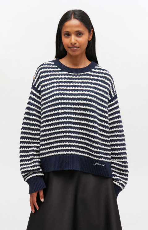 Este jersey presenta cuello redondo, mangas largas con bordes acanalados, un logotipo de GANNI y un detalle de botón en el cuello.