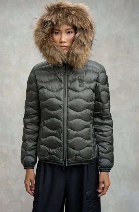 Plumífero hidrorrepelente acolchado con ondas horizontales y perfil de capucha en pluma auténtica. Prenda icónica Blauer con relleno natural, cálido y poco voluminoso, para estar siempre a la moda.