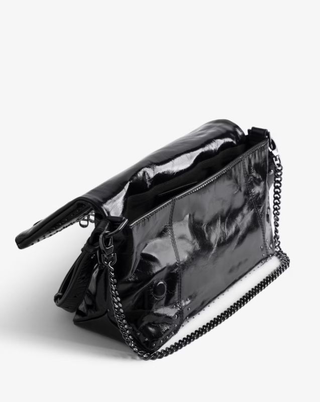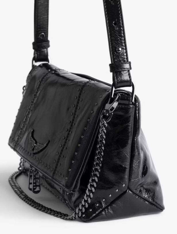 Bolso de cuero charol efecto vintage adornado con tachuelas y bandolera, con cadena y alas distintivas adornadas con strass.