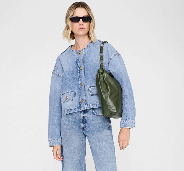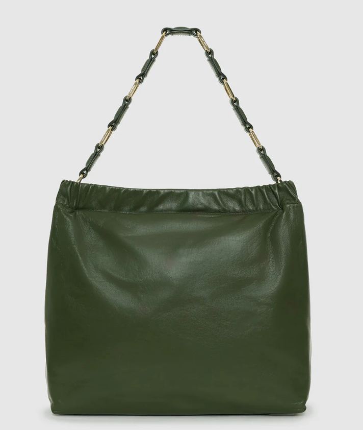 Un bolso de hombro confeccionado en suave piel verde oliva con un brillo sutil.