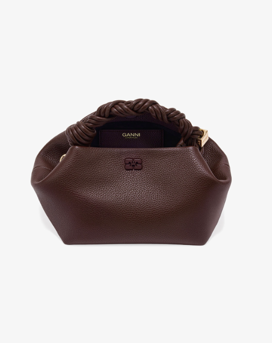 Este bolso luce un logotipo de mariposa GANNI metálico tono sobre tono, un asa retorcida con un nudo trenzado y un dado metálico dorado con el logotipo de mariposa GANNI grabado. El bolso cuenta con un cierre magnético interno, un bolsillo plano para tarjetas en el interior y una correa de hombro ajustable y extraíble para llevarlo cruzado.