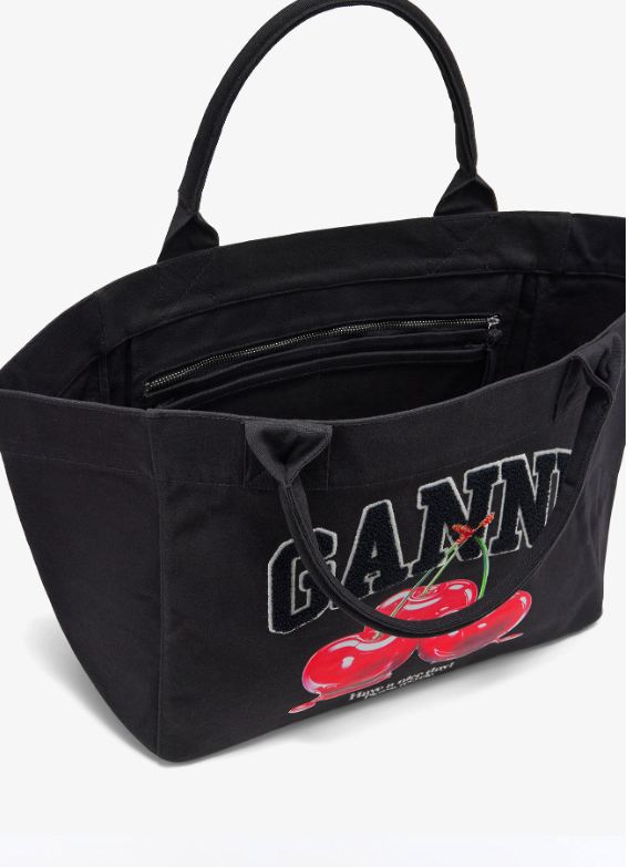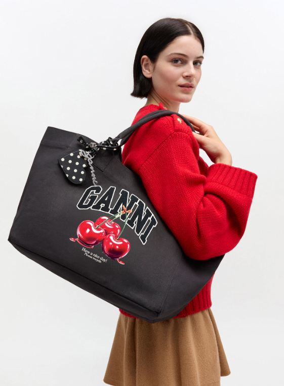Este bolso tote cuenta con asas superiores, un compartimento grande y un logotipo de GANNI con la frase "¡Que tengas un buen día! Recicla".