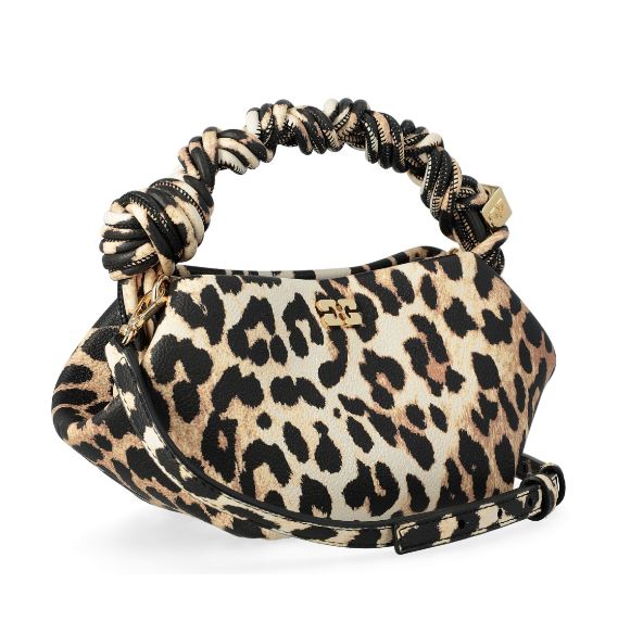 Bolso Ganni Bou Bag tamaño mini, piel vegana reciclada granulada con estampado de leopardo. Se caracteriza por su icónica asa trenzada con nudo y tuerca metálica con el logotipo. Cuenta con cierre magnético, compartimento interior forrado en tela y logotipo Ganni .
