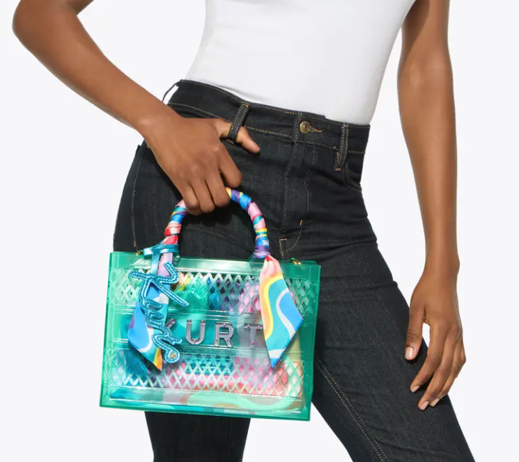 Este pequeño bolso tote de gelatina está confeccionado en malla de vinilo color turquesa. Incluye una bolsa interior con un estampado de espirales de arcoíris a juego con el pañuelo de satén que rodea el asa.