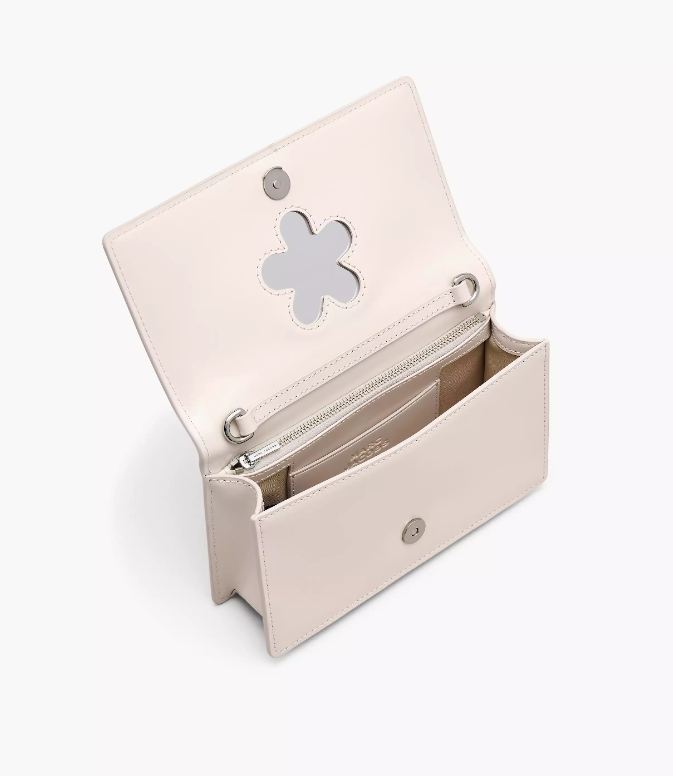 Elegante, estructurada y de alto brillo. El minibolso Glam Mirror está confeccionado en piel Spazzolato brillante y acabado con líneas limpias y detalles juguetones. El asa superior y la correa de cadena extraíble ofrecen múltiples opciones de estilo: llévela como bandolera, bolso de mano, bolsa o miniasa superior. En el interior, un espejo en forma de margarita facilita los retoques sobre la marcha, mientras que un bolsillo con cremallera y una ranura para tarjetas mantienen organizados los objetos esenciales. Compacta en tamaño, audaz en impacto.