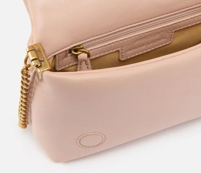El cierre presenta la icónica hebilla Love Birds Diamond Cut de metal con efecto calado y esmaltada tono sobre tono. La bandolera combina la clásica cadena redonda de metal con una práctica bandolera ajustable de piel de napa. El interior cuenta con un forro de ante de microfibra y un bolsillo de parche con cremallera. Activa tu bolso PINKO: verifica la autenticidad de tu artículo y accede a una experiencia personalizada acercando tu smartphone al bordado Love Birds en la parte posterior del bolso.