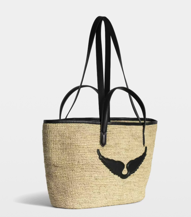 Cesta de rafia con asas de cuero, adornada con alas.
