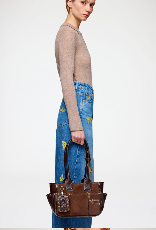 Este bolso cuenta con cierre de cremallera, múltiples bolsillos y una anilla para colgar llaveros o dijes. Cuenta con asas más largas que le dan un toque distintivo y está rematado con una etiqueta colgante de espejo.