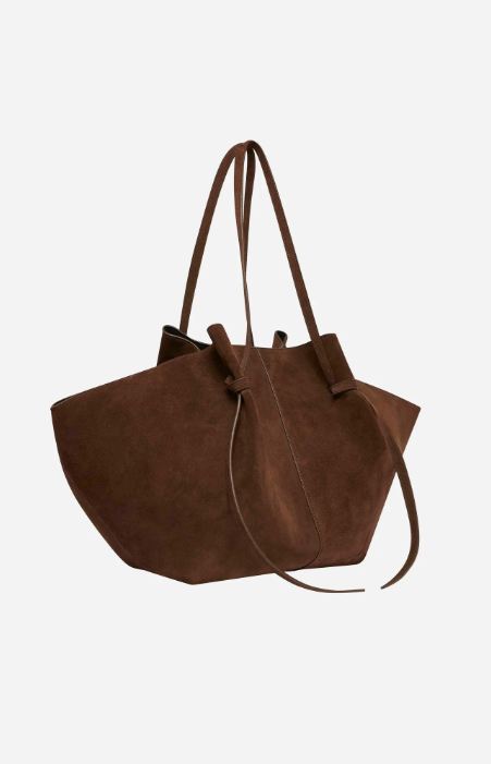 El Mochi Grande es nuestra versión mejorada de nuestro menú diario.Bolsa de manoEl bolso presenta nuestras distintivas curvas orgánicas, pliegues y nudos, y está confeccionado en lujosa gamuza italiana color chocolate.