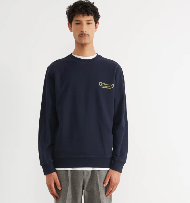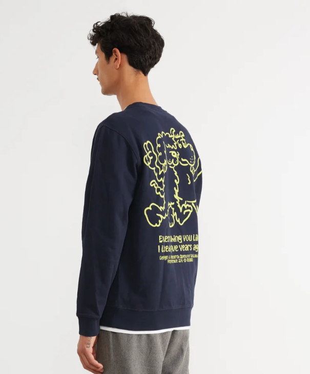 Sudadera azul marino hecha de algodón 100% orgánico en Portugal. Puños y dobladillo acanalados. Con un corte holgado y relajado. Acabada con una ilustración de Edmmond studios en la parte delantera y trasera.