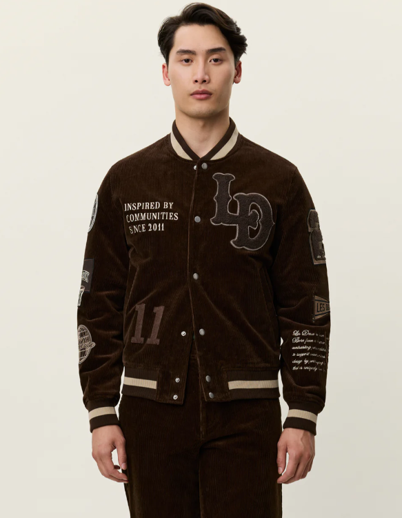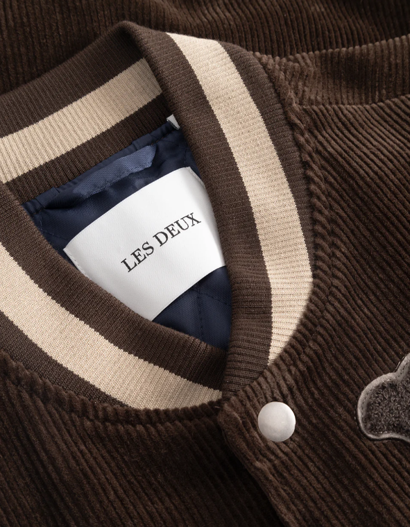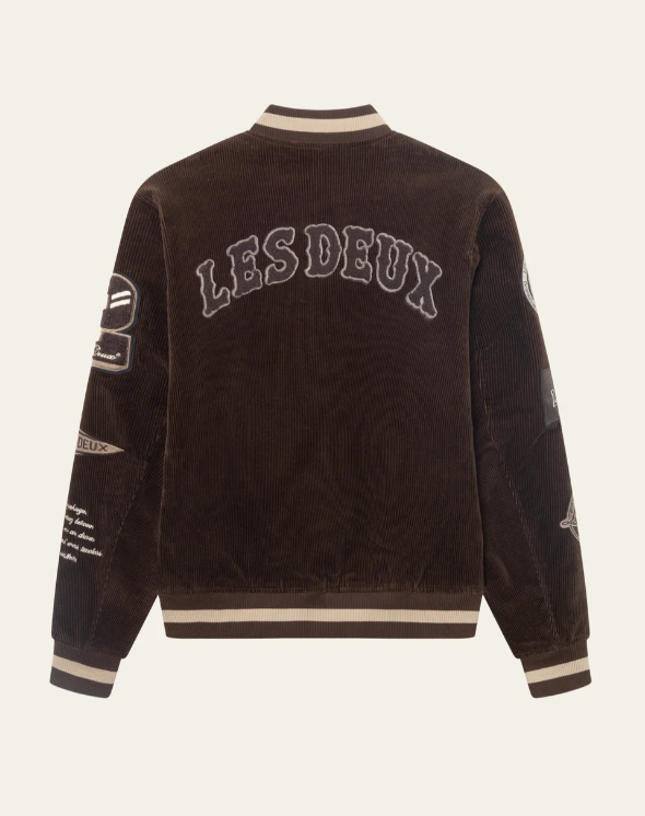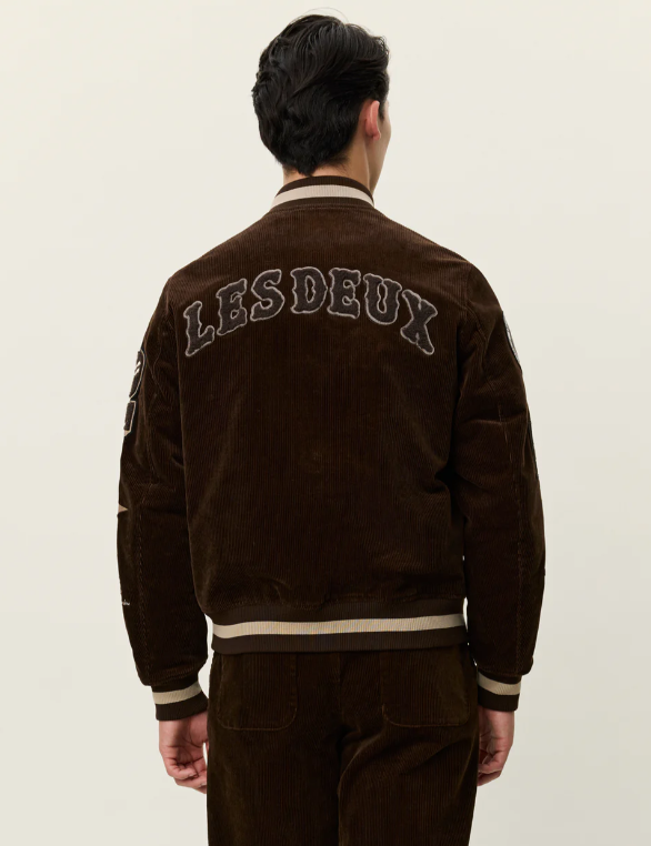 Chaqueta universitarUna de nuestras prendas estrella del invierno. Esta chaqueta universitaria está confeccionada en pana de canalé ancho y decorada con llamativos parches de Les Deux, con ribetes acanalados a rayas y cierre clásico de botones a presión.