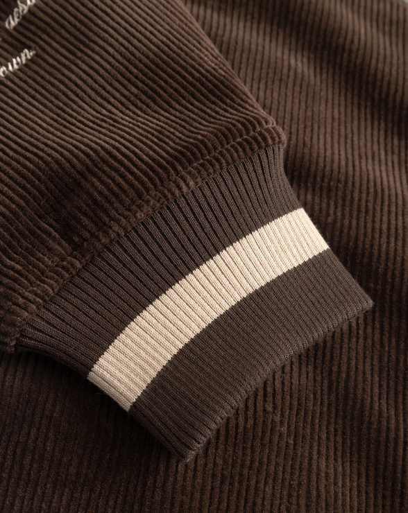 - Cuello, puños y bajo acanalados con detalles de rayas en contrasteia de pana corte regular marrón pizarra