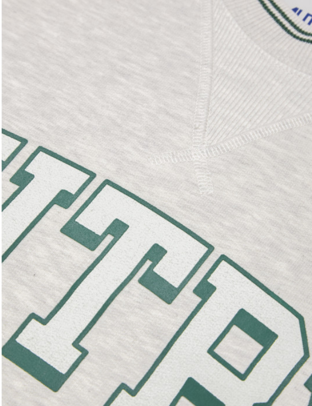 Sudadera de manga larga en felpa gris de mezcla de algodón, inspirada en el estilo universitario americano, con cuello redondo y canesú puntiagudo.