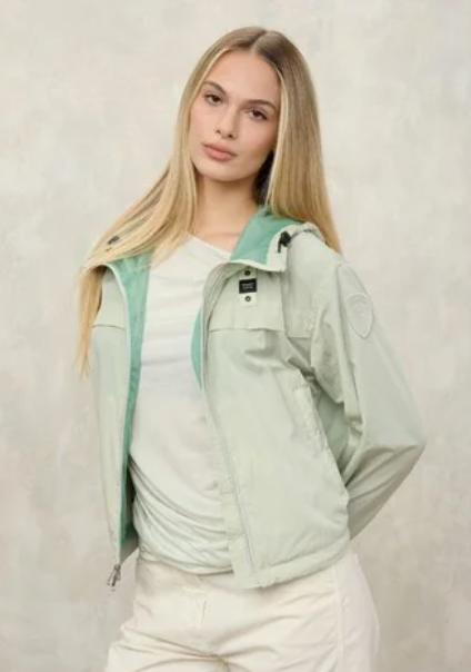 Chaqueta en nylon iridiscente fruncido con capucha fija y forro interno en tejido de malla en tono que permite excelente transpirabilidad. Prenda versátil y funcional, perfecta para actividades al aire libre.