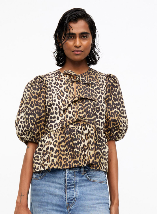 Esta blusa presenta un escote redondo abierto con bandas para atar, mangas abullonadas con bordes elásticos y un dobladillo peplum.