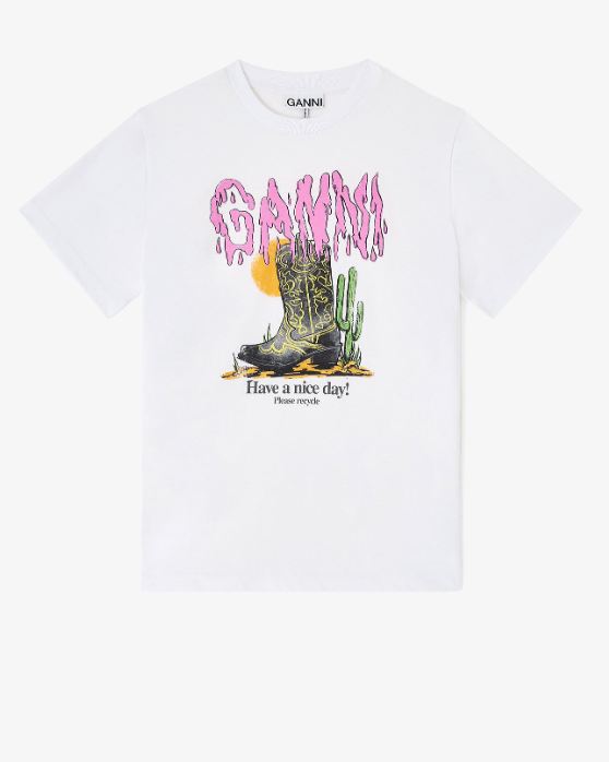 Esta camiseta tiene cuello redondo, mangas cortas y el logotipo de GANNI. Luce un estampado de botas vaqueras y el mensaje "¡Que tengas un buen día! Recicla, por favor".
