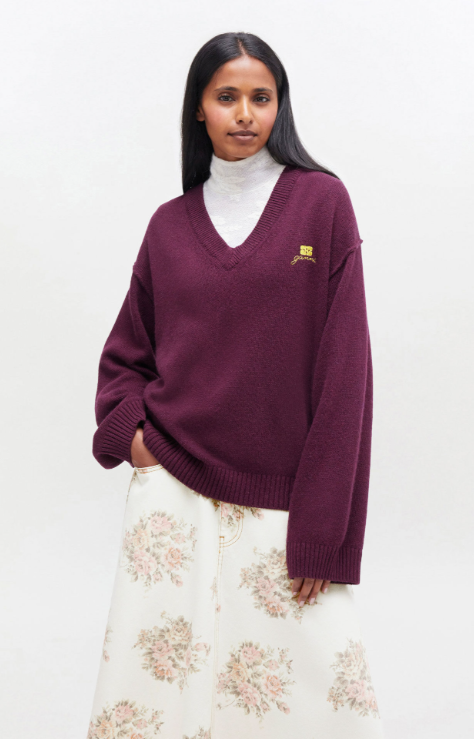 Este jersey presenta un escote en V, bordes acanalados y un logotipo de GANNI.