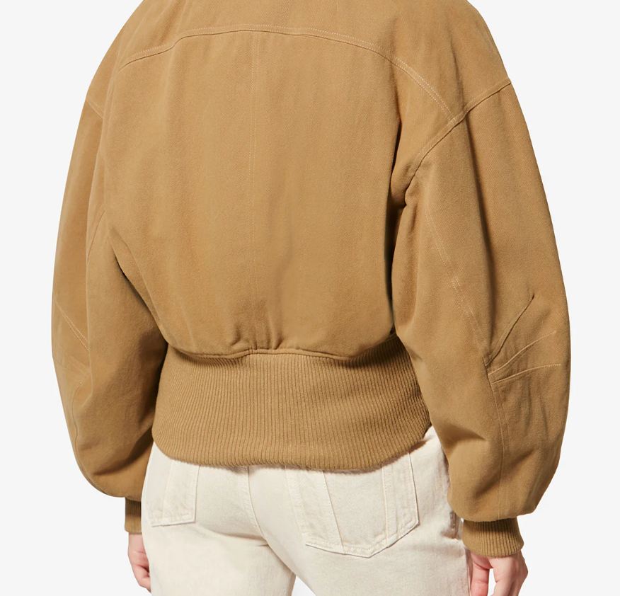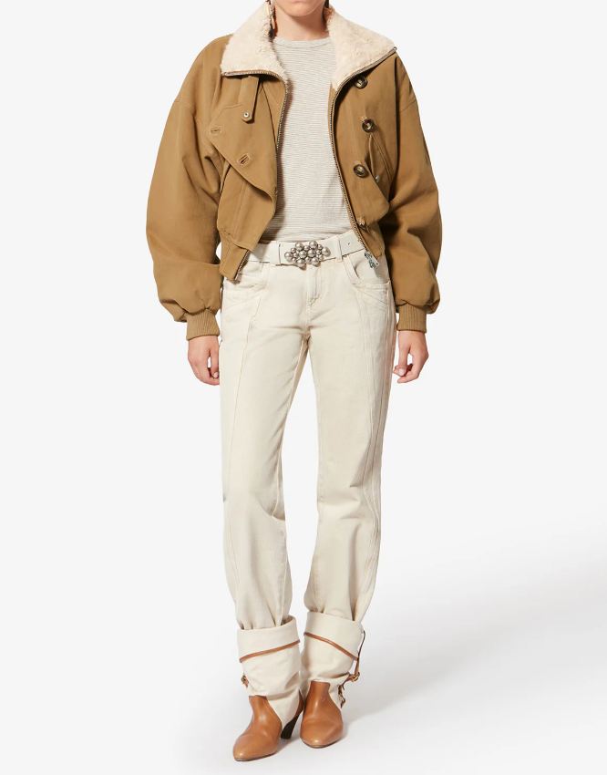 Cierre de cremallera con doble cursor grabado y solapa abotonada asimétrica