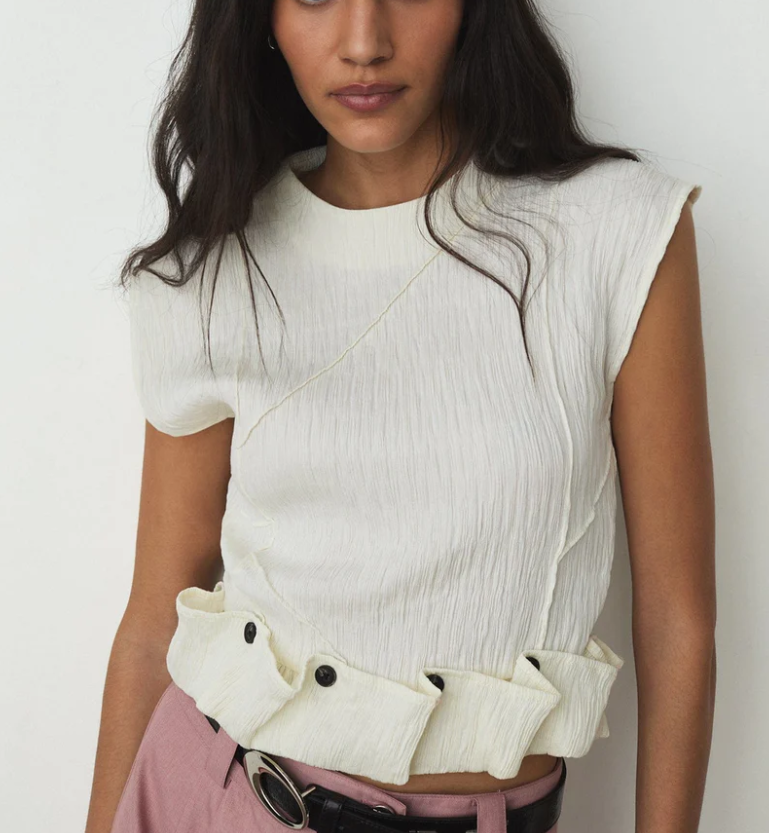 Top texturizado con cuello ligeramente alto y silueta ajustada. Detalle de costuras en la parte delantera y trasera con direcciones asimétricas. Bajo vuelto con ribetes. Cierre de cremallera invisible en la espalda.