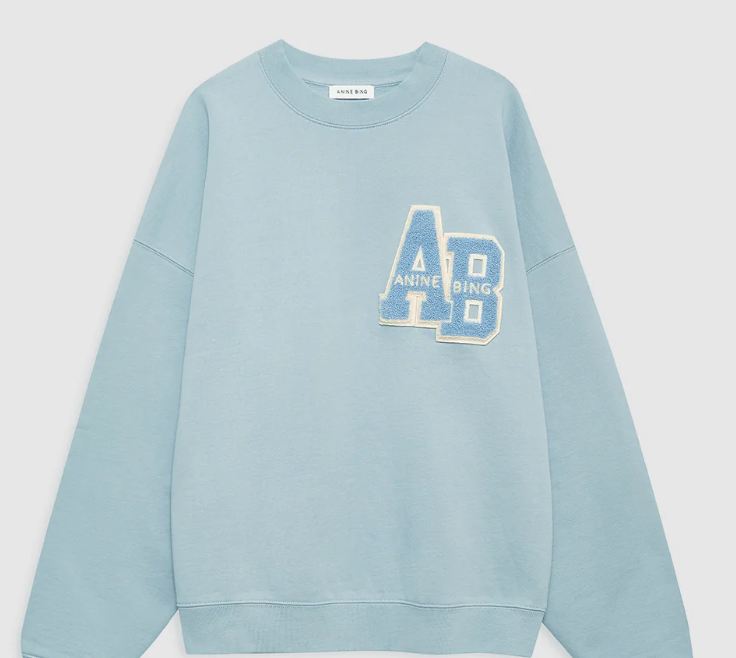 La sudadera extragrande Miles Letterman es un jersey de cuello redondo extragrande confeccionado en felpa de algodón 100 % orgánico de peso medio en azul pastel. Esta prenda informal y relajada luce un parche de chenilla personalizado de ANINE BING Letterman en el pecho.
