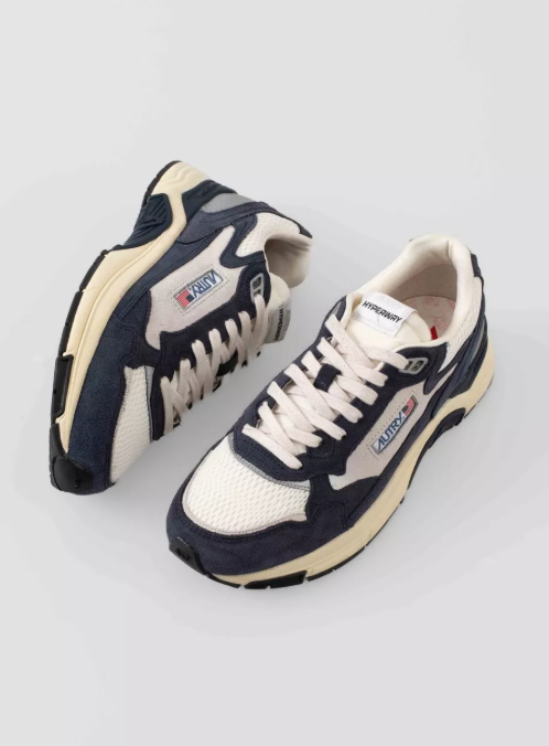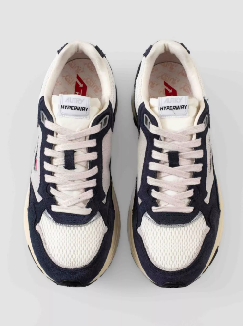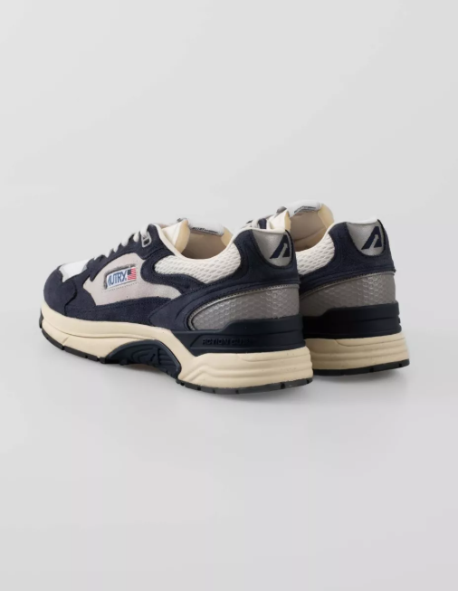 Zapatillas Autry Hyperway Low Man en serraje y malla técnica, color Blue/Silver. Diseño retro-runner con máxima amortiguación y ligereza.