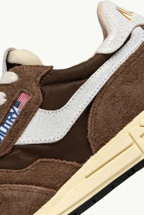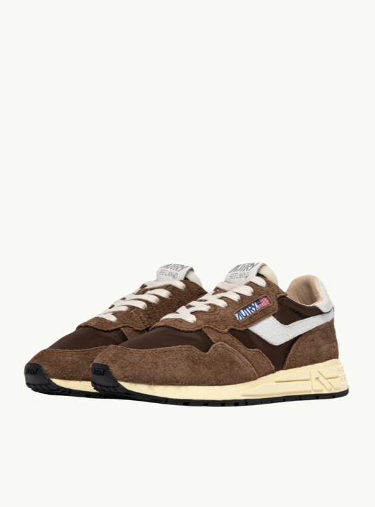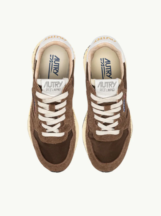 Las zapatillas Reelwind combinan el estilo característico de Autry con elementos inspirados en el mundo del running. Con una silueta elegante y un diseño retro inspirado en los años 80, ofrecen ligereza, flexibilidad y un agarre óptimo. El modelo para hombre está confeccionado en una mezcla de nailon verde y ante, con paneles laterales de piel blanca con efecto craquelado.