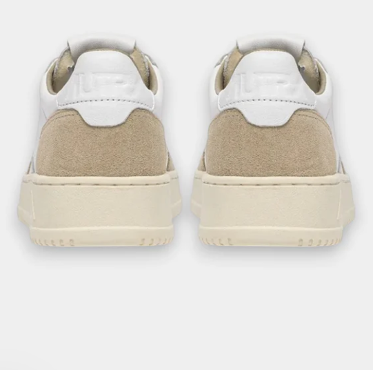 La icónica Medalist de Autry se reinventa con una silueta low de inspiración vintage y una mezcla de piel de cabra blanca y ante beige que aporta textura y sofisticación. El logo en relieve sobre el talón y el lateral sella su carácter inconfundible, mientras que la puntera microperforada y la suela de goma garantizan transpirabilidad y sujeción durante todo el día.