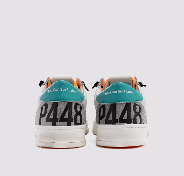 El Jack Acqua Orange luce una piel blanca integral con detalles de ante gris, una lengüeta de ante naranja fluorescente y un refuerzo del talón de cuero azul claro. Cordones negros, nuestra distintiva suela P448 envejecida a mano y un dibujo fucsia completan el look. Cambia el par de cordones plateados adicionales para un look brillante.