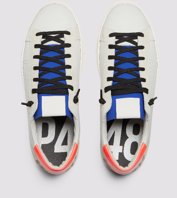 El Jack Flash está revestido de cuero blanco y ante beige claro, con detalles en cuero azul fluorescente y naranja. Cordones de algodón negro y suelas de color amarillo fluorescente completan el conjunto.