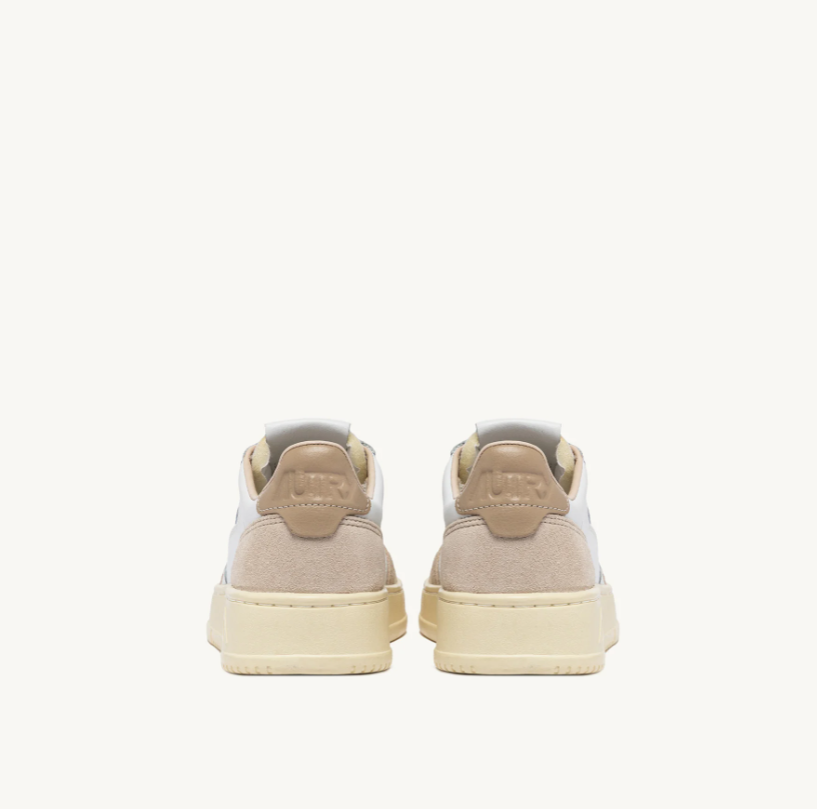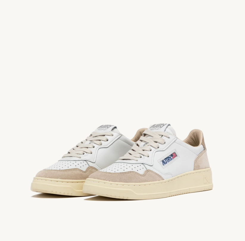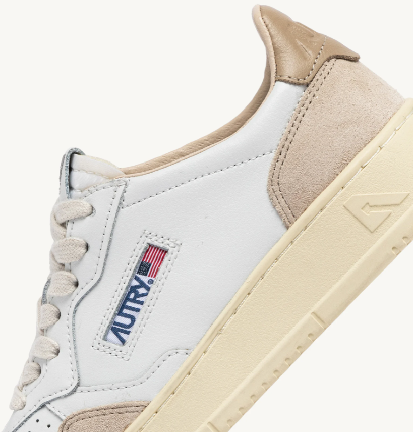 Estas zapatillas deportivas para hombre están confeccionadas con cuero blanco suave de aspecto auténtico y están terminadas con refuerzos de gamuza beige para una combinación gráfica y táctil audaz. El detalle de cuero beige que adorna el talón está personalizado con el logotipo de Autry.