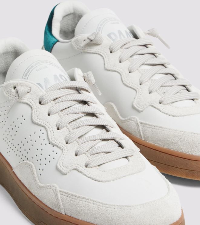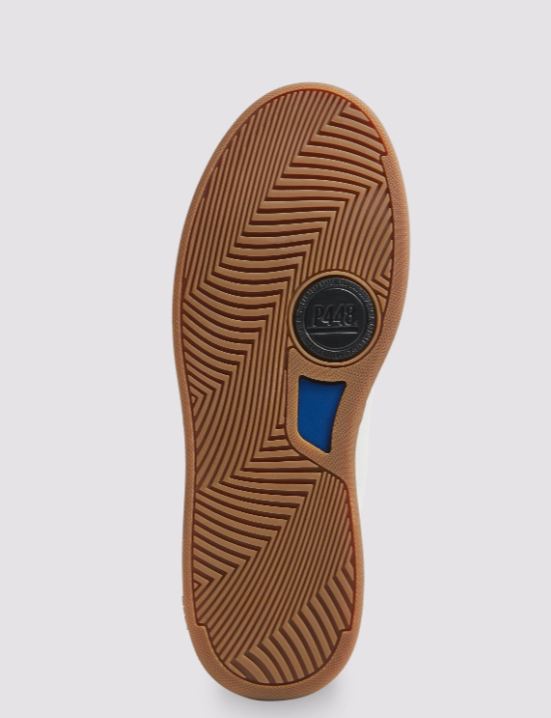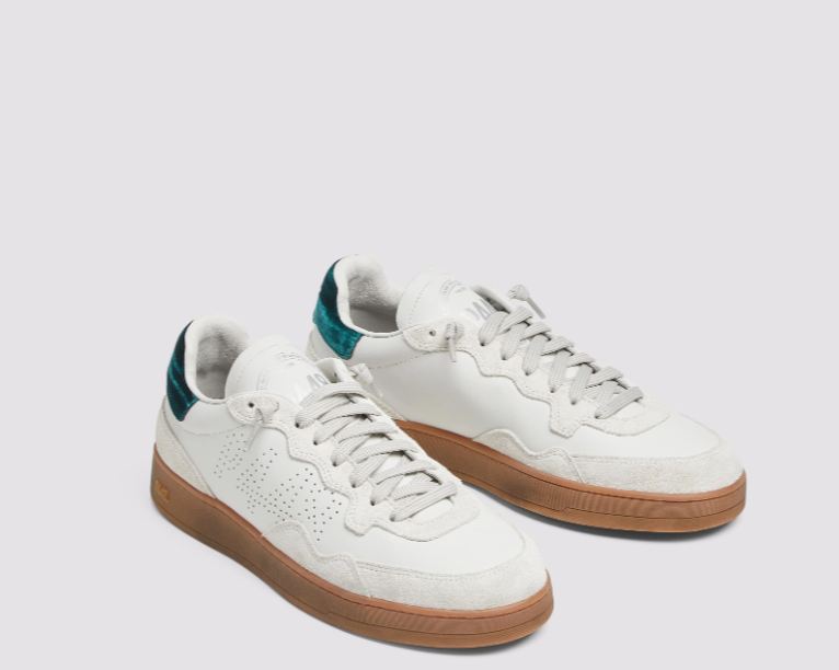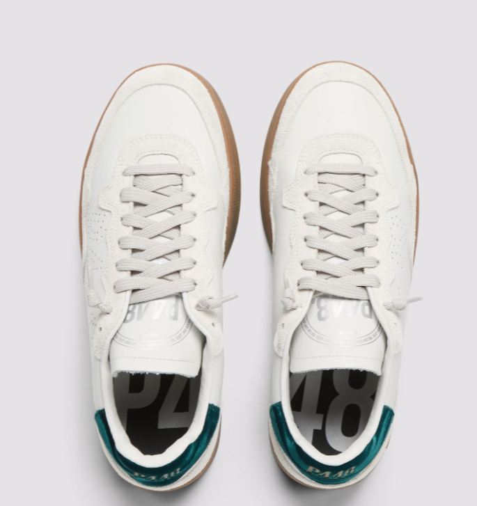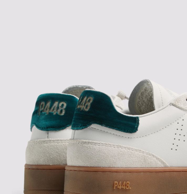 El Vert White/Verde presenta una superficie de cuero blanco con detalles de ante blanco, realzado por una lengüeta de terciopelo verde oscuro y cordones plateados. Nuestras exclusivas suelas de goma ámbar P448 están diseñadas pensando en los skaters, con dibujo en espiga y punto de pivote para un agarre superior y máxima comodidad.