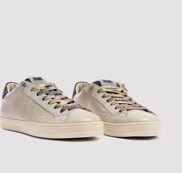 El John Panna está revestido de cuero color crema, con detalles en la lengüeta y el talón de cuero metalizado negro, y cordones multicolor a juego con puntas metálicas doradas. Nuestra distintiva suela de goma P448 y dibujo plateado rematan el look. Puedes cambiar el par de cordones blancos adicionales para completar el look.