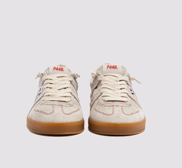 Las Monza Stitch Grey lucen una pana texturizada color marfil con costuras rojas en contraste. Los cordones de algodón encerado color crema y nuestra distintiva suela de goma P448 realzan el look. Puedes cambiarlas por un par adicional de cordones de algodón beige para un look sencillo.