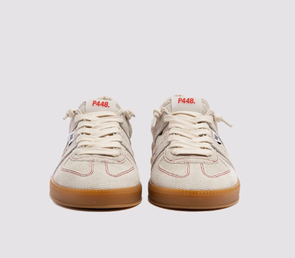 Las Monza Stitch Grey lucen una pana texturizada color marfil con costuras rojas en contraste. Los cordones de algodón encerado color crema y nuestra distintiva suela de goma P448 realzan el look. Puedes cambiarlas por un par adicional de cordones de algodón beige para un look sencillo.